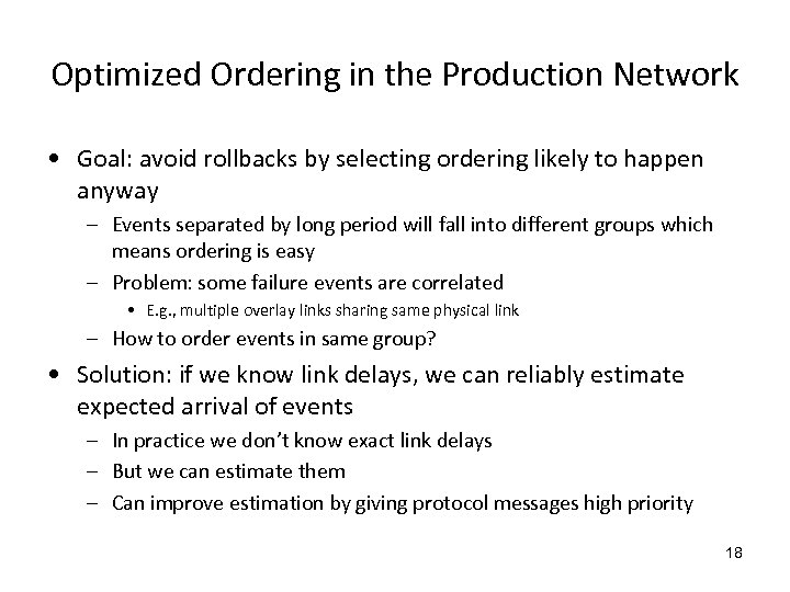 Optimized Ordering in the Production Network • Goal: avoid rollbacks by selecting ordering likely to happen anyway – Events separated by long period will fall into different groups which means ordering is easy – Problem: some failure events are correlated • E. g. , multiple overlay links sharing same physical link – How to order events in same group? • Solution: if we know link delays, we can reliably estimate expected arrival of events – In practice we don’t know exact link delays – But we can estimate them – Can improve estimation by giving protocol messages high priority 18