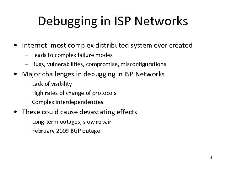 Debugging in ISP Networks • Internet: most complex distributed system ever created – Leads to complex failure modes – Bugs, vulnerabilities, compromise, misconfigurations • Major challenges in debugging in ISP Networks – Lack of visibility – High rates of change of protocols – Complex interdependencies • These could cause devastating effects – Long-term outages, slow repair – February 2009 BGP outage 1