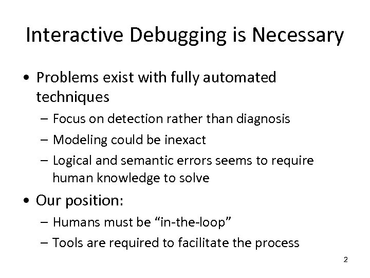 Interactive Debugging is Necessary • Problems exist with fully automated techniques – Focus on detection rather than diagnosis – Modeling could be inexact – Logical and semantic errors seems to require human knowledge to solve • Our position: – Humans must be “in-the-loop” – Tools are required to facilitate the process 2