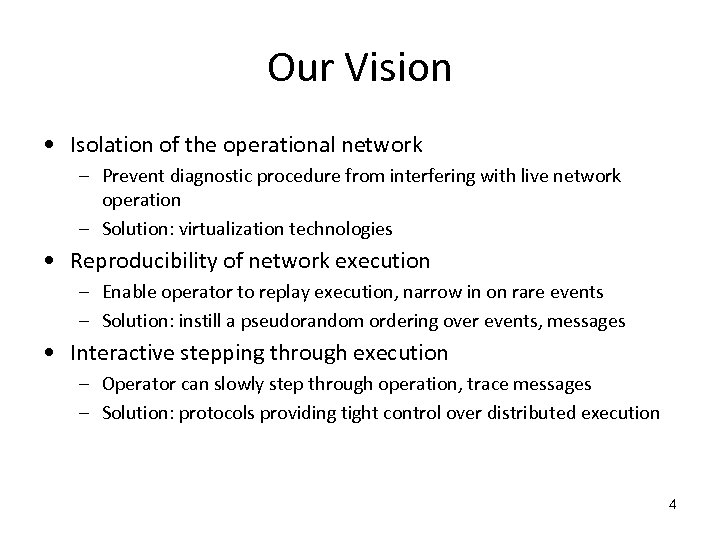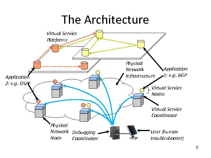 Our Vision • Isolation of the operational network – Prevent diagnostic procedure from interfering with live network operation – Solution: virtualization technologies • Reproducibility of network execution – Enable operator to replay execution, narrow in on rare events – Solution: instill a pseudorandom ordering over events, messages • Interactive stepping through execution – Operator can slowly step through operation, trace messages – Solution: protocols providing tight control over distributed execution 4