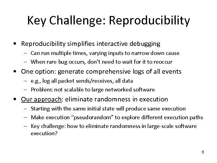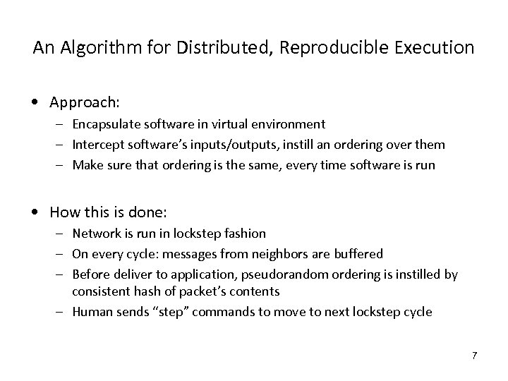 Key Challenge: Reproducibility • Reproducibility simplifies interactive debugging – Can run multiple times, varying inputs to narrow down cause – When rare bug occurs, don’t need to wait for it to reoccur • One option: generate comprehensive logs of all events – e. g. , log all packet sends/receives, all data – Problem: not scalable to large networked software • Our approach: eliminate randomness in execution – Starting with the same initial state will produce same execution – Make execution “pseudorandom” to explore different execution paths – Key challenge: how to eliminate randomness in large-scale software execution? 6
