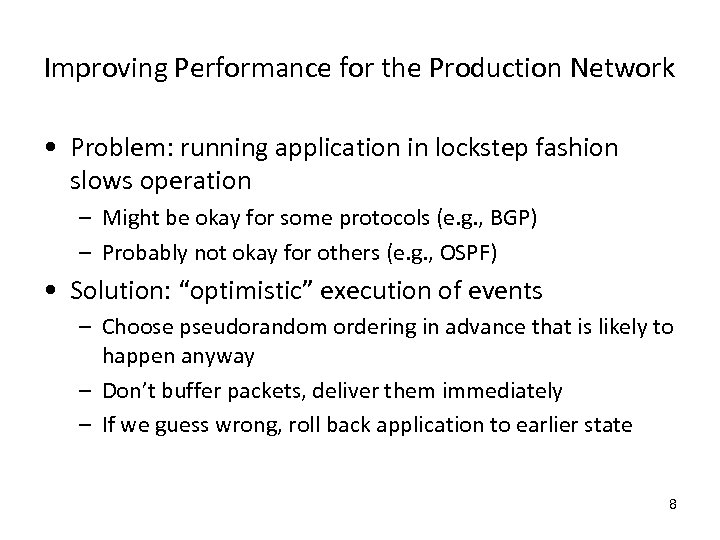 Improving Performance for the Production Network • Problem: running application in lockstep fashion slows operation – Might be okay for some protocols (e. g. , BGP) – Probably not okay for others (e. g. , OSPF) • Solution: “optimistic” execution of events – Choose pseudorandom ordering in advance that is likely to happen anyway – Don’t buffer packets, deliver them immediately – If we guess wrong, roll back application to earlier state 8