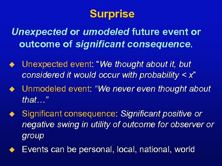 Surprise Unexpected or umodeled future event or outcome of significant consequence. u Unexpected event: “We thought about it, but considered it would occur with probability < x” u Unmodeled event: “We never even thought about that…” u Significant consequence: Significant positive or negative swing in utility of outcome for observer or group u Events can be personal, local, national, world