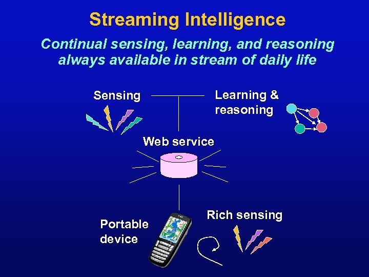 Streaming Intelligence Continual sensing, learning, and reasoning always available in stream of daily life Learning & reasoning Sensing Web service Portable device Rich sensing