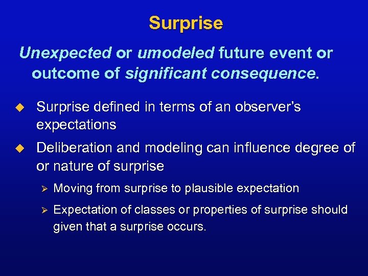 Surprise Unexpected or umodeled future event or outcome of significant consequence. u Surprise defined in terms of an observer’s expectations u Deliberation and modeling can influence degree of or nature of surprise Ø Moving from surprise to plausible expectation Ø Expectation of classes or properties of surprise should given that a surprise occurs.