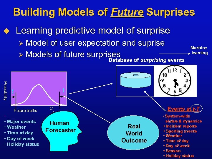 Building Models of Surprise Learning predictive model of surprise u Ø Model of user expectation and suprise Ø Models of future surprises Database of surprising events • Data store Probabiilliity P ro b a b t y ! Expectations ! Events at t Future traffic • • Major events • Weather • Time of day • Day of week • Holiday status • System-wide Human Forecaster Real World Outcome status & dynamics • Incident reports • Sporting events • Weather • Time of day • Day of week • Season • Holiday status