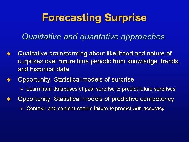 Forecasting Surprise Qualitative and quantative approaches u Qualitative brainstorming about likelihood and nature of surprises over future time periods from knowledge, trends, and historical data u Opportunity: Statistical models of surprise Ø u Learn from databases of past surprise to predict future surprises Opportunity: Statistical models of predictive competency Ø Context- and content-centric failure to predict with accuracy