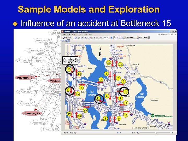 Building forecasting model Bayesian network. Predictive Models from Data • System-wide status & dynamics • Incident reports • Sporting events • Weather • Time of day • Day of week • Season • Holiday status Database of sensed events • Data store Max likely time until bottleneck evaporates Machine Learning • Base-level predictions