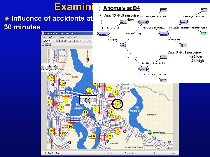 Anomaly at B 4 Examining Details Acc 15 . 5 surprise Influence of accidents at B 15 and B 3 on anomaly at B 4 at -low 30 minutes u Acc 3 . 5 surprise -. 25 low -. 25 high
