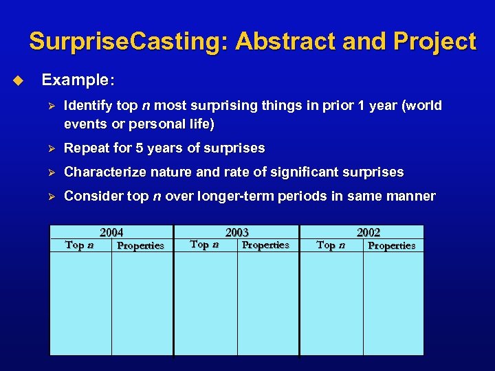 Surprise. Casting: Abstract and Project u Example: Ø Identify top n most surprising things in prior 1 year (world events or personal life) Ø Repeat for 5 years of surprises Ø Characterize nature and rate of significant surprises Ø Consider top n over longer-term periods in same manner Last 2004 12 months Top n Properties Top n 2003 Properties Top n 2002 Properties