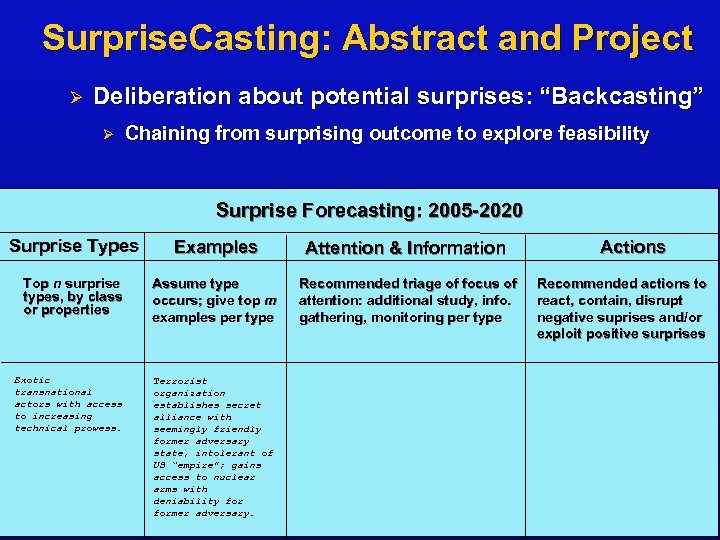 Surprise. Casting: Abstract and Project Ø Deliberation about potential surprises: “Backcasting” Ø Chaining from surprising outcome to explore feasibility Surprise Forecasting: 2005 -2020 Surprise Types Examples Attention & Information Top n surprise types, by class or properties Assume type occurs; give top m examples per type Recommended triage of focus of attention: additional study, info. gathering, monitoring per type Exotic transnational actors with access to increasing technical prowess. Terrorist organization establishes secret alliance with seemingly friendly former adversary state, intolerant of US “empire”; gains access to nuclear arms with deniability former adversary. Actions Recommended actions to react, contain, disrupt negative suprises and/or exploit positive surprises