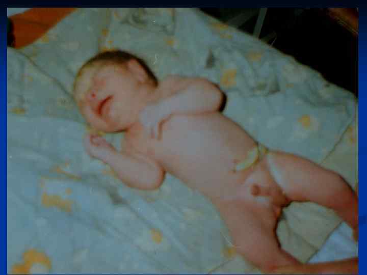 The more light form is pyodermia. On the district place of skin (around of umbilical wound, on the low part of abdomen, subaxillar region, buttocks) there are one or few vesicels very small size. n After rupture of that there is erosion, hilling during 1 -2 days. n The reatment is local: toilet of skin, bath with, 005% solution of Potassium permanganate, treatment of a skin gentian violet 1% in spirit.