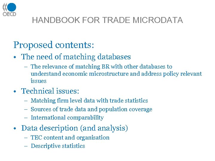 HANDBOOK FOR TRADE MICRODATA Proposed contents: • The need of matching databases – The relevance of matching BR with other databases to understand economic microstructure and address policy relevant issues • Technical issues: – Matching firm level data with trade statistics – Sources of trade data and population coverage – International comparability • Data description (and analysis) – TEC content and organisation – Descriptive statistics