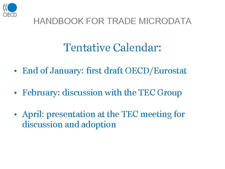 HANDBOOK FOR TRADE MICRODATA Tentative Calendar: • End of January: first draft OECD/Eurostat • February: discussion with the TEC Group • April: presentation at the TEC meeting for discussion and adoption