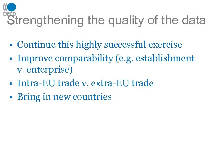 Strengthening the quality of the data • Continue this highly successful exercise • Improve comparability (e. g. establishment v. enterprise) • Intra-EU trade v. extra-EU trade • Bring in new countries
