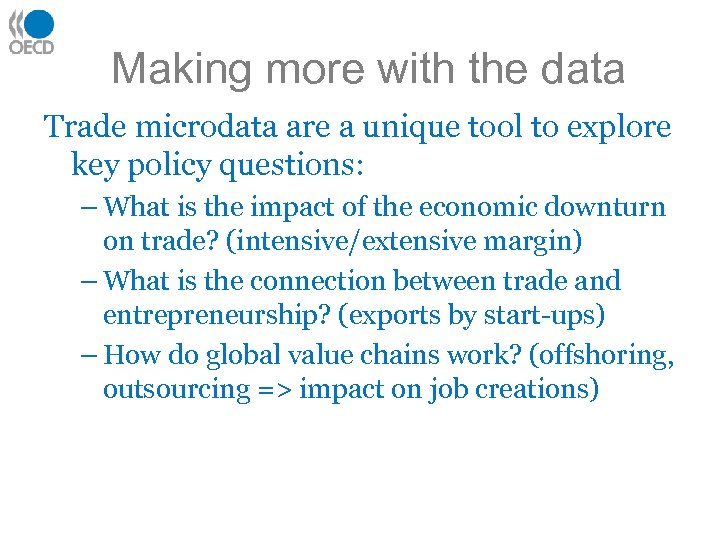 Making more with the data Trade microdata are a unique tool to explore key policy questions: – What is the impact of the economic downturn on trade? (intensive/extensive margin) – What is the connection between trade and entrepreneurship? (exports by start-ups) – How do global value chains work? (offshoring, outsourcing => impact on job creations)