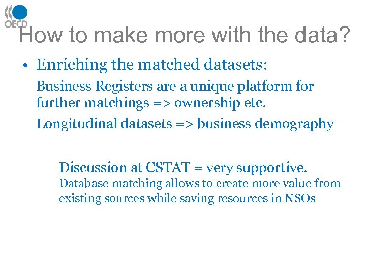 How to make more with the data? • Enriching the matched datasets: Business Registers are a unique platform for further matchings => ownership etc. Longitudinal datasets => business demography Discussion at CSTAT = very supportive. Database matching allows to create more value from existing sources while saving resources in NSOs