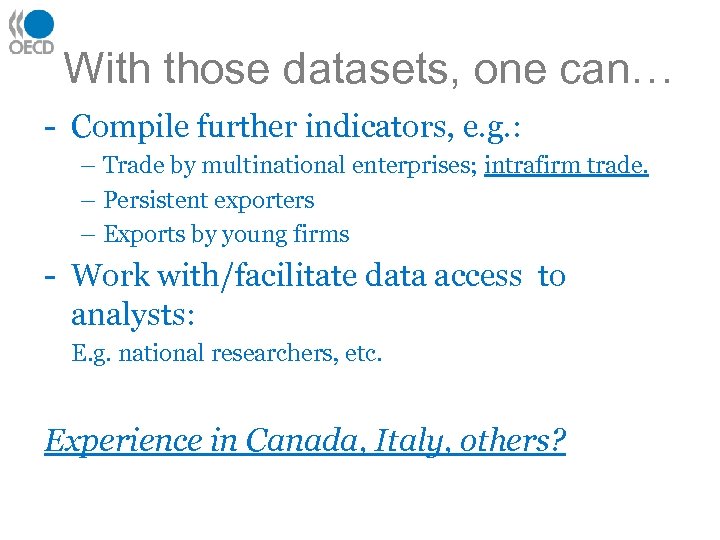 With those datasets, one can… - Compile further indicators, e. g. : – Trade by multinational enterprises; intrafirm trade. – Persistent exporters – Exports by young firms - Work with/facilitate data access to analysts: E. g. national researchers, etc. Experience in Canada, Italy, others?