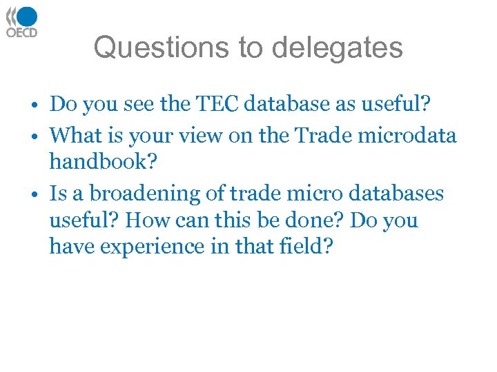 Questions to delegates • Do you see the TEC database as useful? • What is your view on the Trade microdata handbook? • Is a broadening of trade micro databases useful? How can this be done? Do you have experience in that field?