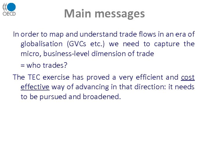 Main messages In order to map and understand trade flows in an era of globalisation (GVCs etc. ) we need to capture the micro, business-level dimension of trade = who trades? The TEC exercise has proved a very efficient and cost effective way of advancing in that direction: it needs to be pursued and broadened.