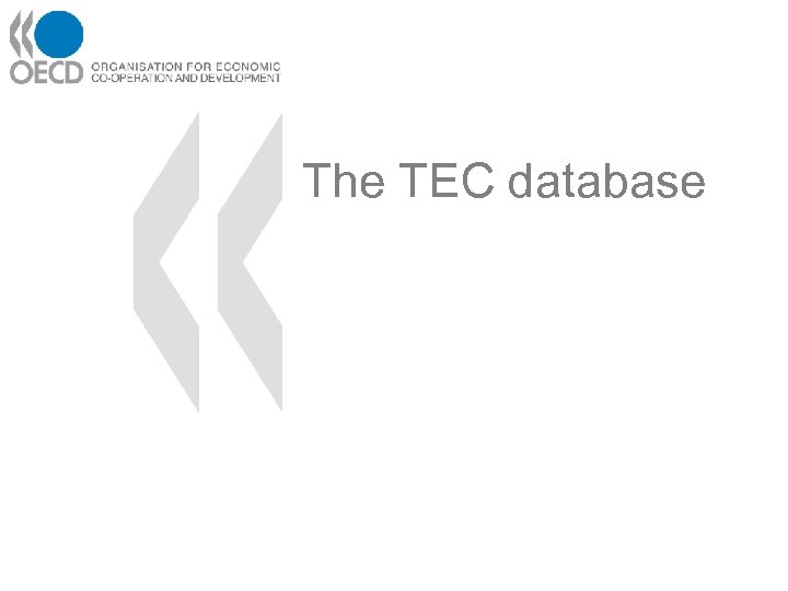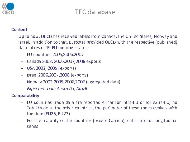 TEC database Content Up to now, OECD has received tables from Canada, the United States, Norway and Israel. In addition to that, Eurostat provided OECD with the respective (published) data tables of 19 EU member states: – EU countries 2005, 2006, 2007 – Canada 2003, 2006, 2007, 2008 exports – USA 2003, 2005 (exports) – Israel 2006, 2007, 2008 (exports) – Norway 2003, 2005, 2006, 2007 (aggregated data) – Expected soon: Australia, Brazil Comparability – EU countries trade data are reported either for Intra-EU or for extra-EU, no Total trade as the other countries, the perimeter of these zones evolves with the time (EU 25, EU 27) – For the majority of the countries (except Canada), data are not longitudinal series