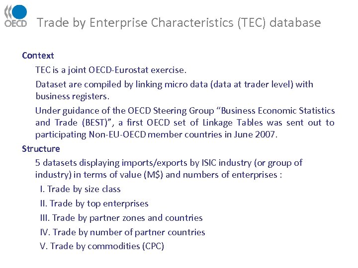 Trade by Enterprise Characteristics (TEC) database Context TEC is a joint OECD-Eurostat exercise. Dataset are compiled by linking micro data (data at trader level) with business registers. Under guidance of the OECD Steering Group “Business Economic Statistics and Trade (BEST)”, a first OECD set of Linkage Tables was sent out to participating Non-EU-OECD member countries in June 2007. Structure 5 datasets displaying imports/exports by ISIC industry (or group of industry) in terms of value (M$) and numbers of enterprises : I. Trade by size class II. Trade by top enterprises III. Trade by partner zones and countries IV. Trade by number of partner countries V. Trade by commodities (CPC)