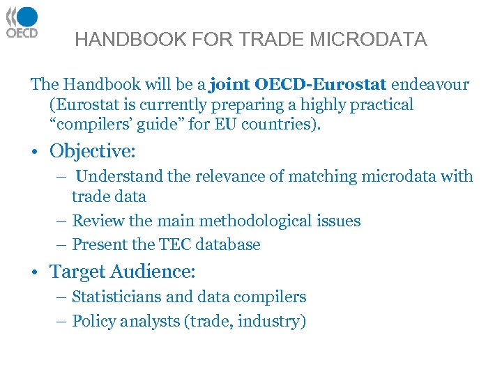 HANDBOOK FOR TRADE MICRODATA The Handbook will be a joint OECD-Eurostat endeavour (Eurostat is currently preparing a highly practical “compilers’ guide” for EU countries). • Objective: – Understand the relevance of matching microdata with trade data – Review the main methodological issues – Present the TEC database • Target Audience: – Statisticians and data compilers – Policy analysts (trade, industry)