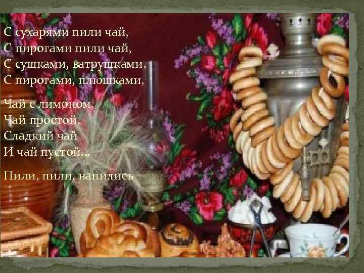 С сухарями пили чай, С пирогами пили чай, С сушками, ватрушками, С пирогами, плюшками, Чай с лимоном, Чай простой, Сладкий чай И чай пустой. . . Пили, пили, напились