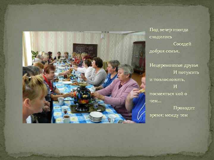 Под вечер иногда сходились Соседей добрая семья, Нецеремонные друзья И потужить и позлословить, И посмеяться кой о чем. . . Проходит время; между тем