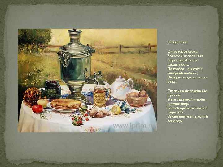 О. Карелин Он во главе стола большой начальник: Зеркально блещут медные бока, На голове - пыхтит с заваркой чайник, Внутри - воды кипящая река. Случайно не задень его руками: В его стальной утробе жгучий жар! Гостей приветит чаем с пирогами Семьи поилец - русский самовар.