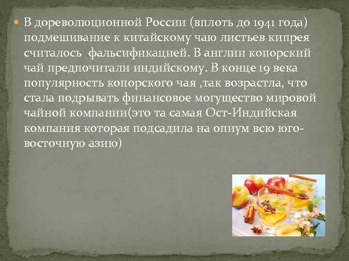 В конце 19 столетия появляется так наз фальсифицирован ный чай. Стали добавлять травы. И главной -стал иван-чай. или копорский