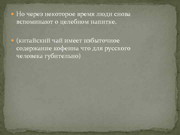 Но через некоторое время люди снова вспоминают о целебном напитке. (китайский чай имеет избыточное содержание кофеина что для русского человека губительно)
