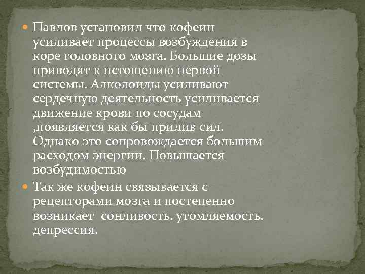 Павлов установил что кофеин усиливает процессы возбуждения в коре головного мозга. Большие дозы приводят к истощению нервой системы. Алколоиды усиливают сердечную деятельность усиливается движение крови по сосудам , появляется как бы прилив сил. Однако это сопровождается большим расходом энергии. Повышается возбудимостью Так же кофеин связывается с рецепторами мозга и постепенно возникает сонливость. утомляемость. депрессия.