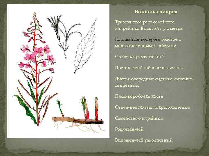 Ботаника кипрея Травенистое раст семейства кипрейних. Высотой 1. 5 -2 метра. Корневище-ползучее толстое с многочисленными побегами Стебель прямостоячий Цветок двойной около цветник Листья очередные сидячие линейноланцетные. Плод-коробочка кисть Отдел-цветковые покрытосеменые Семейство-кипрейные Род-иван-чай Вид иван-чай узколистный