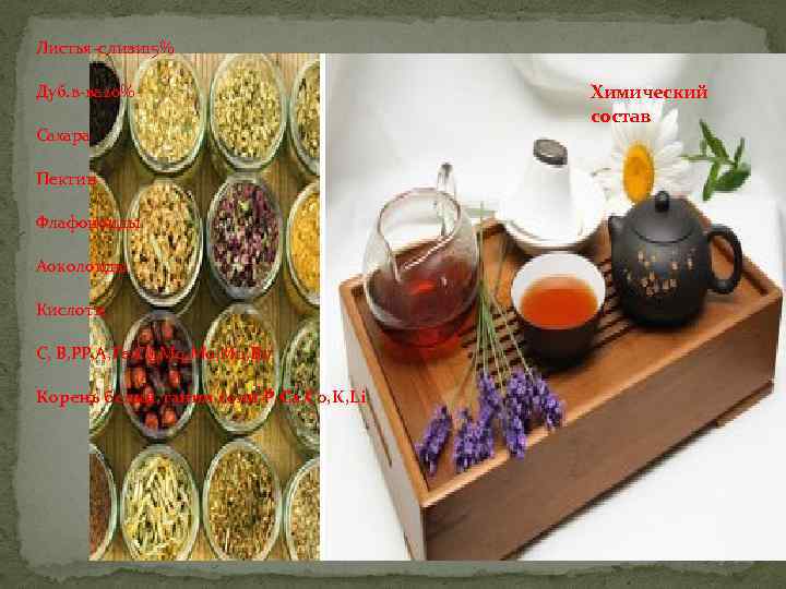 Листья-слизи 15% Дуб. в-ва 20% Сахара Пектин Флафоноиды Аоколоиды Кислоты C, B, PP, A, Fe, Cu, Mq, Mo, Mn, Br/ Корень белки, танин соли P, Ca, Co, K, Li Химический состав