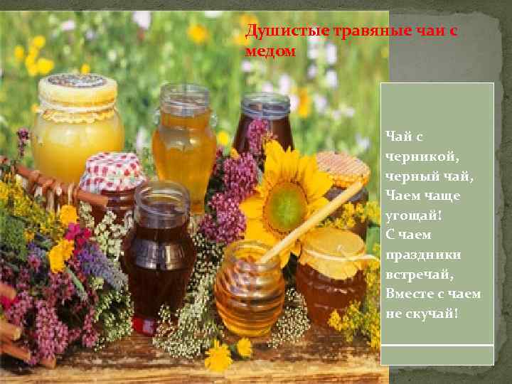 Душистые травяные чаи с медом Чай с черникой, черный чай, Чаем чаще угощай! С чаем праздники встречай, Вместе с чаем не скучай!