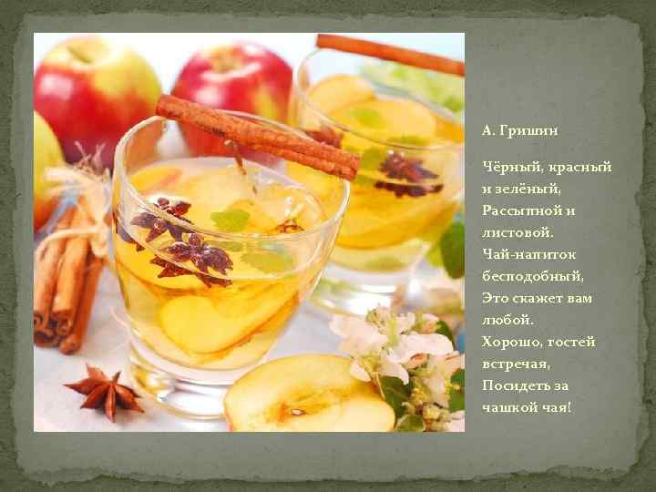 А. Гришин Чёрный, красный и зелёный, Рассыпной и листовой. Чай-напиток бесподобный, Это скажет вам любой. Хорошо, гостей встречая, Посидеть за чашкой чая!