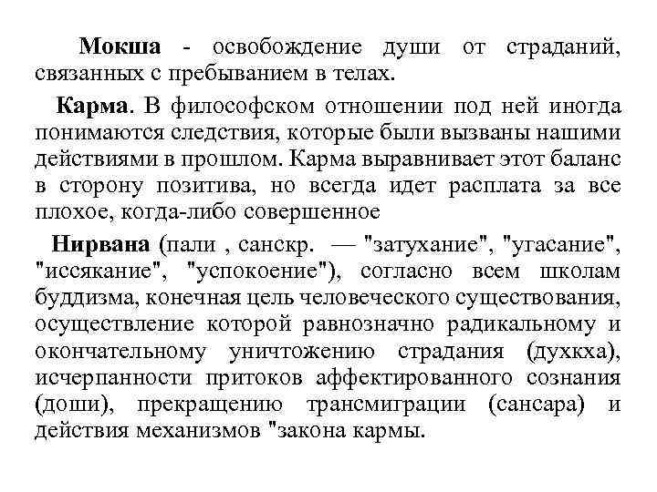 Мокша освобождение души от страданий, связанных с пребыванием в телах. Карма. В философском отношении под ней иногда понимаются следствия, которые были вызваны нашими действиями в прошлом. Карма выравнивает этот баланс в сторону позитива, но всегда идет расплата за все плохое, когда либо совершенное Нирвана (пали , санскр. — "затухание", "угасание", "иссякание", "успокоение"), согласно всем школам буддизма, конечная цель человеческого существования, осуществление которой равнозначно радикальному и окончательному уничтожению страдания (духкха), исчерпанности притоков аффектированного сознания (доши), прекращению трансмиграции (сансара) и действия механизмов "закона кармы.