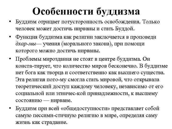 Особенности буддизма • Буддизм отрицает потусторонность освобождения. Только человек может достичь нирваны и стать Буддой. • Функция буддизма как религии заключается в проповеди дхар мы— учения (морального закона), при помощи которого можно достичь нирваны. • Проблемы мироздания не стоят в центре буддизма. Он конста тирует, что количество миров бесконечно. В буддизме нет бога как творца и соответственно как высшего существа. Эта религия пото му смогла стать мировой, что открывала теоретический доступ каждому человеку, независимо от его социальной или этничес кой принадлежности, к высшему состоянию — нирване. • Буддизм при всей «общедоступности» представляет собой самую пессими стичную религию в мире, определяя саму жизнь как страдание.