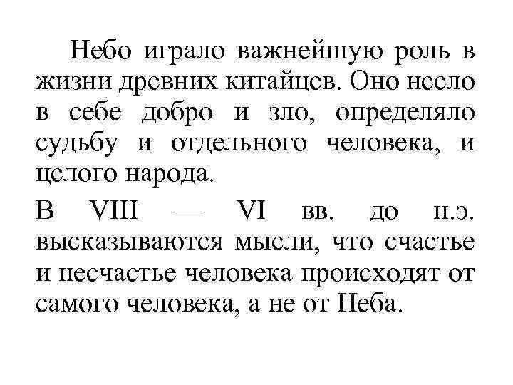 Небо играло важнейшую роль в жизни древних китайцев. Оно несло в себе добро и зло, определяло судьбу и отдельного человека, и целого народа. В VIII — VI вв. до н. э. высказываются мысли, что счастье и несчастье человека происходят от самого человека, а не от Неба.