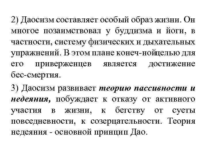 2) Даосизм составляет особый образ жизни. Он многое позаимствовал у буддизма и йоги, в частности, систему физических и дыхательных упражнений. В этом плане конеч нойцелью для его приверженцев является достижение бес смертия. 3) Даосизм развивает теорию пассивности и недеяния, побуждает к отказу от активного участия в жизни, к бегству от суеты повседневности, к созерцательности. Теория недеяния основной принцип Дао.