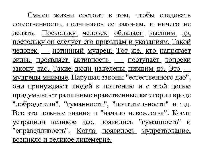 Смысл жизни состоит в том, чтобы следовать естественности, подчиняясь ее законам, и ничего не делать. Поскольку человек обладает высшим дэ, постольку он следует его призывам и указаниям. Такой человек — истинный мудрец. Тот же, кто напрягает силы, проявляет активность — поступает вопреки закону дао. Такие люди наделены низшим дэ. Это — мудрецы мнимые. Нарушая законы "естественного дао", они принуждают людей к почтению и с этой целью придумывают различные нравственные категории вроде "добродетели", "гуманности", "почтительности" и т. д. Все это ложные знания и "начало невежества". Когда устранили великое дао, появились "гуманность" и "справедливость". Когда появилось мудрствование, возникло и великое лицемерие.