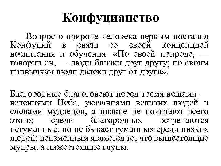 Конфуцианство Вопрос о природе человека первым поставил Конфуций в связи со своей концепцией воспитания и обучения. «По своей природе, — говорил он, — люди близки другу; по своим привычкам люди далеки друг от друга» . Благородные благоговеют перед тремя вещами — велениями Неба, указаниями великих людей и словами мудрецов, а низкие не почитают всего этого; среди благородных встречаются негуманные, но не бывает гуманных среди низких людей; неизменным является то, что вышестоящие мудры, а нижестоящие глупы.