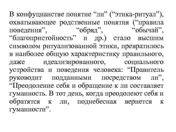 В конфуцианстве понятие “ли” (“этика ритуал”), охватывающее родственные понятия (“правила поведения”, “обряд”, “обычай”, “благопристойность” и др. ) стало высшим символом ритуализованной этики, превратилось в наиболее общую характеристику правильного, даже идеализированного, социального устройства и поведения человека: “Правитель руководит подданными посредством ли”, “Преодоление себя и обращение к ли составляет гуманность. В тот день, когда преодолеют себя и обратятся к ли, поднебесная вернется к гуманности”.