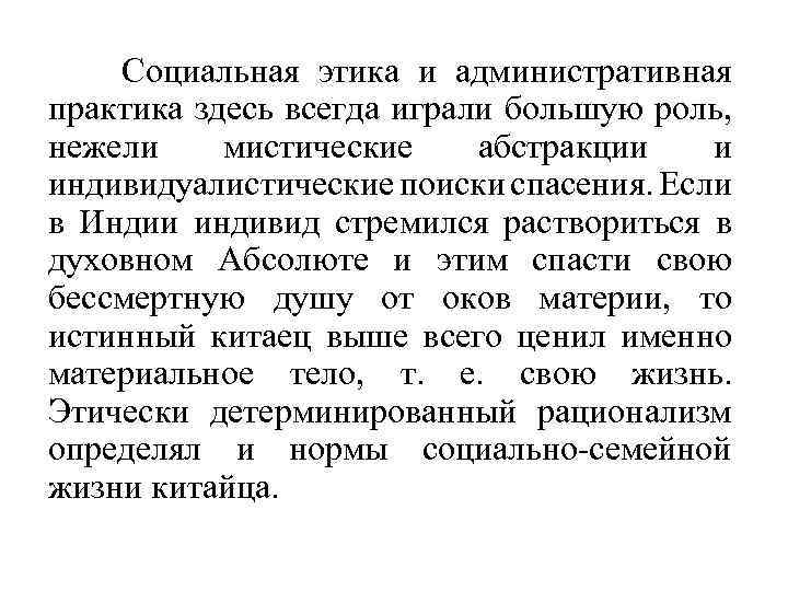Социальная этика и административная практика здесь всегда играли большую роль, нежели мистические абстракции и индивидуалистические поиски спасения. Если в Индии индивид стремился раствориться в духовном Абсолюте и этим спасти свою бессмертную душу от оков материи, то истинный китаец выше всего ценил именно материальное тело, т. е. свою жизнь. Этически детерминированный рационализм определял и нормы социально семейной жизни китайца.