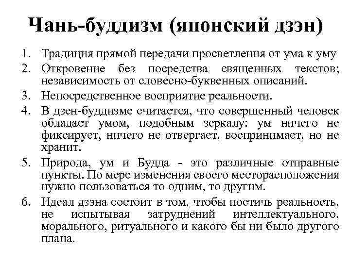 Чань-буддизм (японский дзэн) 1. Традиция прямой передачи просветления от ума к уму 2. Откровение без посредства священных текстов; независимость от словесно буквенных описаний. 3. Непосредственное восприятие реальности. 4. В дзен буддизме считается, что совершенный человек обладает умом, подобным зеркалу: ум ничего не фиксирует, ничего не отвергает, воспринимает, но не хранит. 5. Природа, ум и Будда это различные отправные пункты. По мере изменения своего месторасположения нужно пользоваться то одним, то другим. 6. Идеал дзэна состоит в том, чтобы постичь реальность, не испытывая затруднений интеллектуального, морального, ритуального и какого бы ни было другого плана.