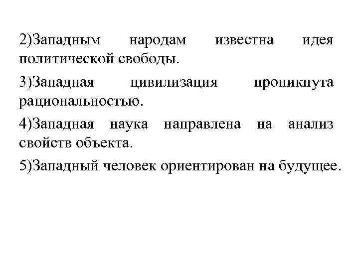 2)Западным народам известна идея политической свободы. 3)Западная цивилизация проникнута рациональностью. 4)Западная наука направлена на анализ свойств объекта. 5)Западный человек ориентирован на будущее.