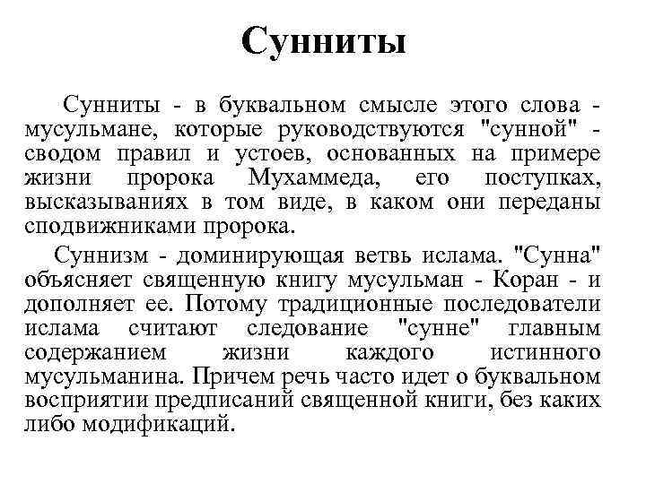 Сунниты в буквальном смысле этого слова мусульмане, которые руководствуются "сунной" сводом правил и устоев, основанных на примере жизни пророка Мухаммеда, его поступках, высказываниях в том виде, в каком они переданы сподвижниками пророка. Суннизм доминирующая ветвь ислама. "Сунна" объясняет священную книгу мусульман Коран и дополняет ее. Потому традиционные последователи ислама считают следование "сунне" главным содержанием жизни каждого истинного мусульманина. Причем речь часто идет о буквальном восприятии предписаний священной книги, без каких либо модификаций.