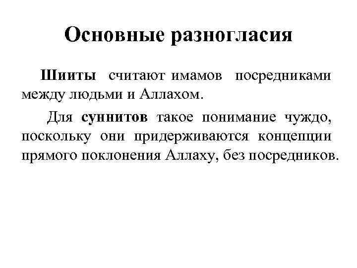 Основные разногласия Шииты считают имамов посредниками между людьми и Аллахом. Для суннитов такое понимание чуждо, поскольку они придерживаются концепции прямого поклонения Аллаху, без посредников.