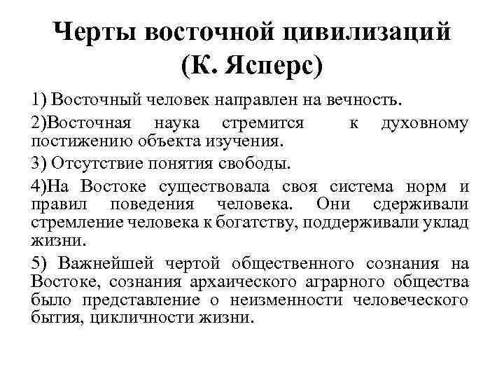 Черты восточной цивилизаций (К. Ясперс) 1) Восточный человек направлен на вечность. 2)Восточная наука стремится к духовному постижению объекта изучения. 3) Отсутствие понятия свободы. 4)На Востоке существовала своя система норм и правил поведения человека. Они сдерживали стремление человека к богатству, поддерживали уклад жизни. 5) Важнейшей чертой общественного сознания на Востоке, сознания архаического аграрного общества было представление о неизменности человеческого бытия, цикличности жизни.